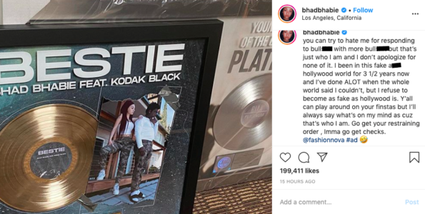 “you can try to hate me for responding to bulls*** with more bulls*** but that’s just who I am and I don’t apologize for none of it. I been in this fake a** hollywood world for 3 1/2 years now and I’ve done ALOT when the whole world said I couldn’t, but I refuse to become as fake as hollywood is. Y’all can play around on your finstas but I’ll always say what’s on my mind as cuz that’s who I am. Go get your restraining order , Imma go get checks.”