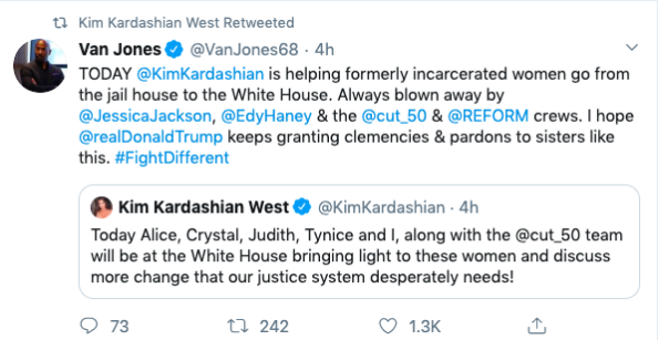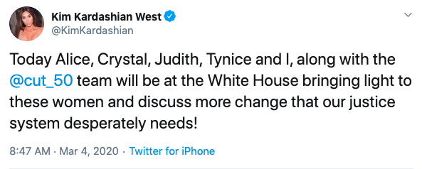 “Today Alice, Crystal, Judith, Tynice and I, along with the @cut_50team will be at the White House bringing light to these women and discuss more change that our justice system desperately needs!”