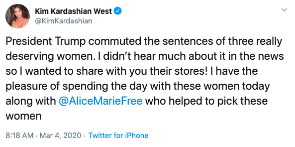 “President Trump commuted the sentences of three really deserving women. I didn’t hear much about it in the news so I wanted to share with you their stores! I have the pleasure of spending the day with these women today along with @AliceMarieFree who helped to pick these women”
