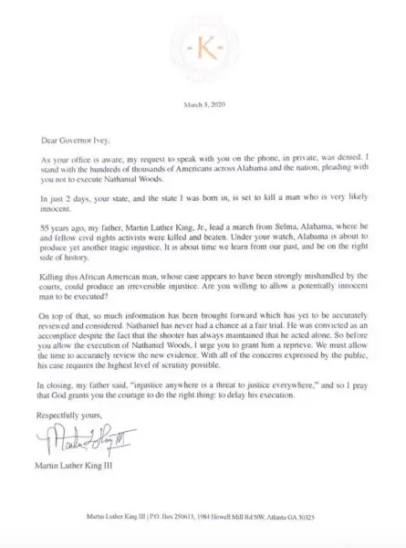 “Nathaniel has never had a chance at a fair trial. He was convicted as an accomplice despite the fact that the shooter has always maintained that he acted alone. So before you allow the execution of Nathaniel Woods, I urge you to grant him a reprieve. We must allow the time to accurately review the new evidence. With all of the concerns expressed by the public, his case requires the highest level of scrutiny possible.”