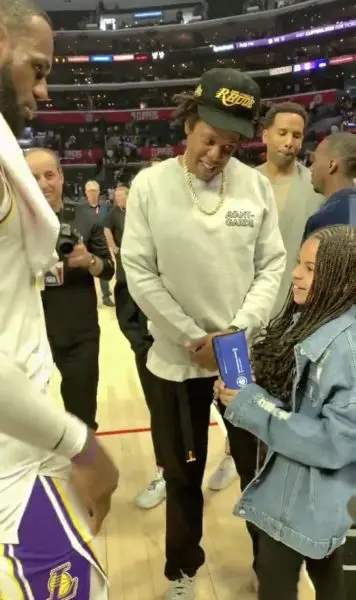 After the Lakers beat the Clippers 112-103, the father-daughter duo made their way onto the court to have a quick chat with James. During their on court chat, Blue Ivy reportedly had a special request for James to do for her. Blue Ivy looked obviously starstruck by James’ huge ora as she tried to push her dad to ask the Lakers superstar for a gift. In the video, Jay-z was overheard saying,