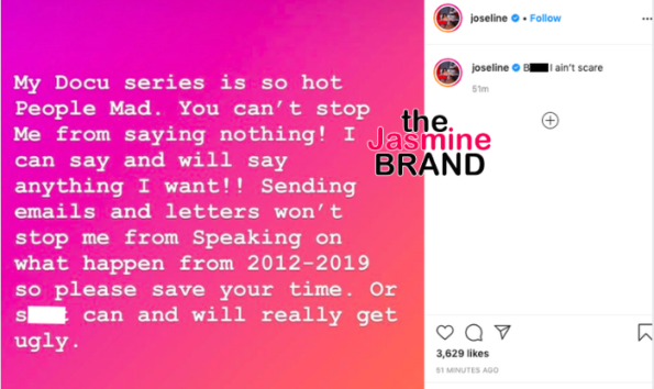 “My Docu series is so hot People Mad. You can’t stop Me from saying nothing! I can say and wil say anything I want!! Sending emails and letters won’t stop me from Speaking on what happen from 2012-2019so please save your time. Or s*** can and will really get ugly.”