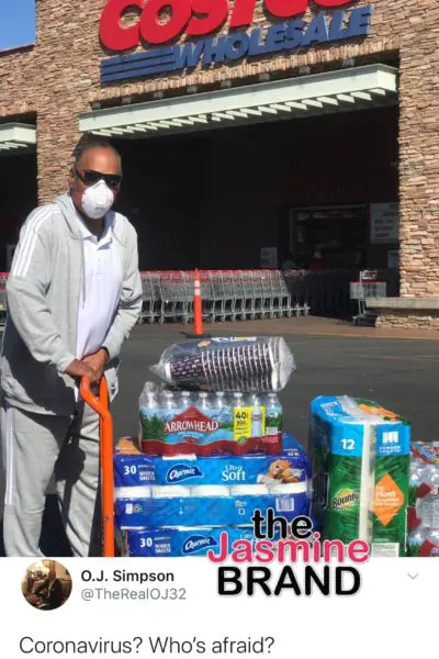 Former football player O.J. Simpson, 72, took to Twitter sharing a photo of his recent visit to a local Costco store. In the photo, the former NFL star was seen buying items in bulk such as toiletries, water, and paper cups stocking up while wearing a surgical mask.
