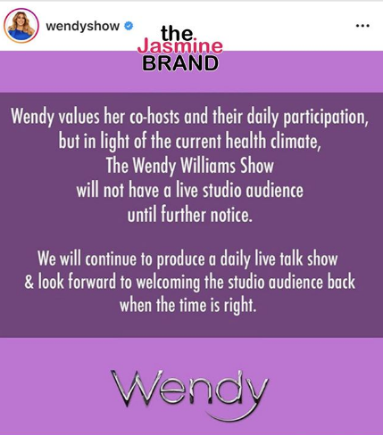 Wendy values her co-hosts and their daily participation, but in light of the current health climate The Wendy Williams Show will not have a live studio audience until further notice.