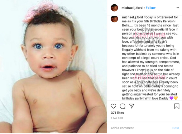 “Today is bittersweet for me as it’s your 5th Birthday Ke’Yoshi Bella…. It’s been 18 months since I last seen your beautiful energetic lil face in person and as bad as I wanna see you, hug you, kiss you, shower you with love, affection, and gifts i can’t because Unfortunately you’re being illegally withheld from me (along with my other babies) by someone who is in contempt of a legal court order.”
