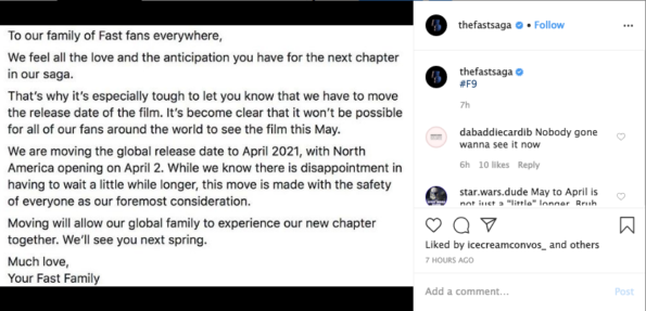 The upcoming premiere date for “Fast & Furious 9” has been pushed back for an entire year. Initially, the popular franchise was scheduled to be released in the United States on May 22, 2020. It will now open globally in April 2021 and in the U.S. on April 2. The studio announced the news today (March 12th). See their announcement below.