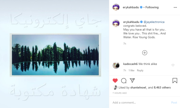 “@erykahbadu @jayelectronica congrats beloved. May you have all that is for you . We love you . This sh*t fire… And Water. Rise Young Gods.”