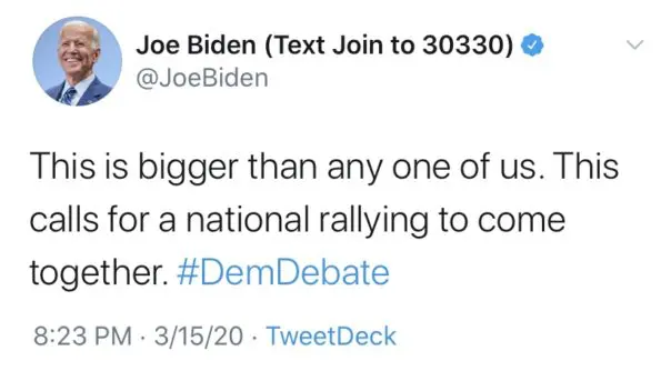 “This is bigger than any one of us. This calls for a national rallying to come together…People want results, not a revolution…My running mate will be a woman. #DemDebate”