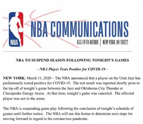“The NBA is suspending game play following the conclusion of [Wednesday night’s] schedule of games until further notice. The NBA will use this hiatus to determine next steps for moving forward in regard to the coronavirus pandemic.”