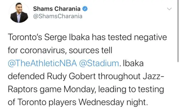 Ibaka was the primary defender responsible for covering Utah’s Gobert throughout most of Monday night’s (March 9th), Jazz-Raptors contest. Thankfully, Ibaka has reportedly tested negative for the virus and has been sent home for self quarantine.