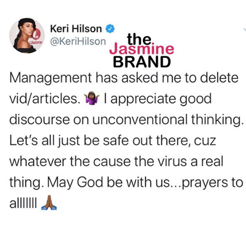 Original Story: Singer Keri Hilson is making headlines over conspiracy theories about the country’s current health scare. She took to Twitter last night (March 15th) and ended up trending due to her opinion on the coronavirus (also known as, COVID-19).