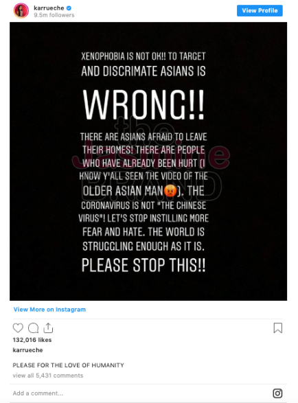 “Xenophobia is not ok!! To target and discriminate Asians is wrong!! There are Asians afraid to leave their homes! There are people who have already been hurt (I know y’all seen the video of the older Asian man). The coronavirus is not ‘The Chinese Virus’! Lets stop instilling more fear and hate. The world is struggling enough as it is. Please stop this!!”