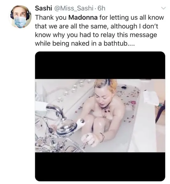Pop icon Madonna is trending on Twitter, and it’s not for releasing a new album full of quarantine tunes. She had an extra special message for fans amid the outbreak of the coronavirus. Visibly naked in a bathtub full of rose petals, the material girl sexily whispered to her Twitter following: