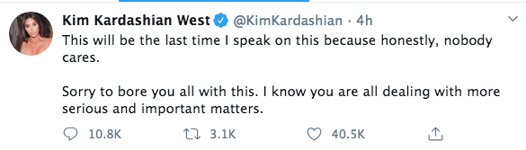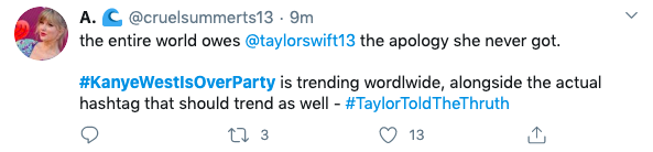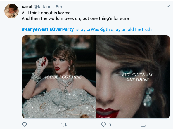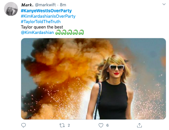 Shortly after Kim K’s tweets, #KimKardashianIsOver began trending on social media. Presumably the hashtag was started by Taylor Swift’s fanbase.
