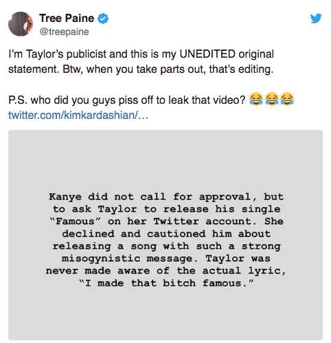 “I’m Taylor’s publicist and this is my UNEDITED original statement. Btw, when you take parts out, that’s editing. P.S. who did you guys piss off to leak that video?”