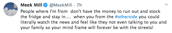 As previously reported, Meek addressed issues for those who have found it difficult to quarantine and stock up on food to protect themselves from the virus. He tweets,