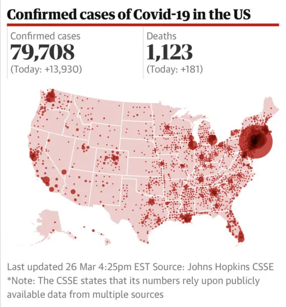 According to the Johns Hopkins CSSE, the Coronavirus pandemic in the United States has seen nearly 80,000 confirmed cases in a matter of weeks.