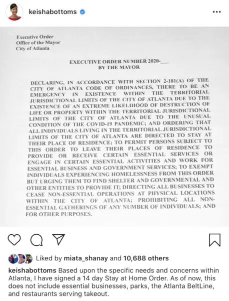 Mayor of Atlanta, Keshia Bottoms announced on Monday (March 23rd), a stay at home order.