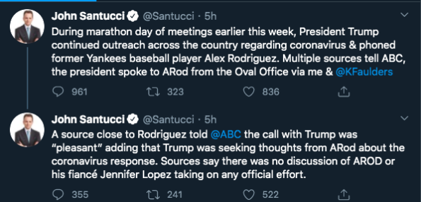 “During marathon day of meetings earlier this week, President Trump continued outreach across the country regarding coronavirus & phoned former Yankees baseball player Alex Rodriguez. Multiple sources tell ABC, the president spoke to ARod from the Oval Office via me & [Katherine Faulders],” Santucci stated on twitter.