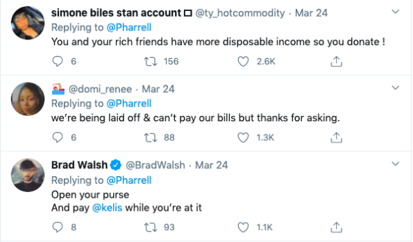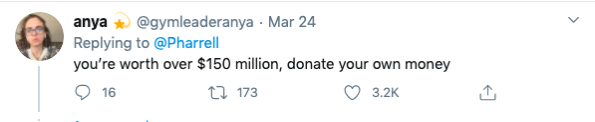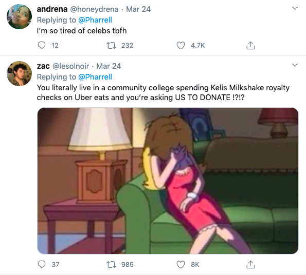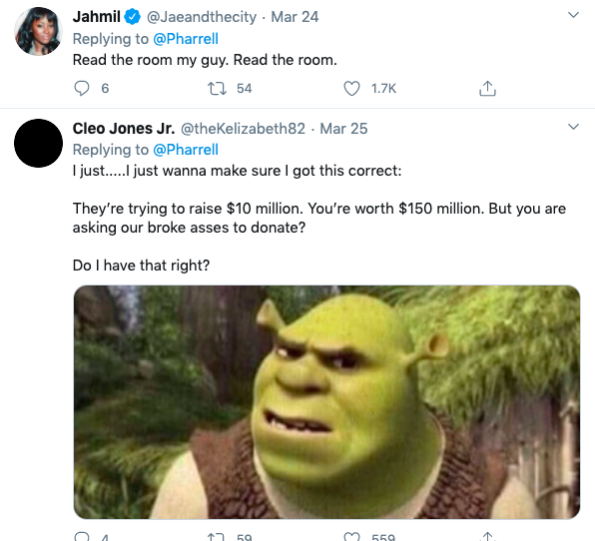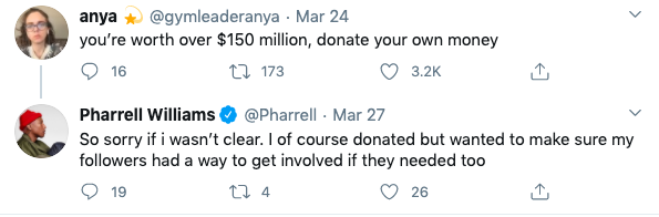 Pharell’s attempt to get his social media following to help with coronavirus relief efforts led to him getting tons of backlash.