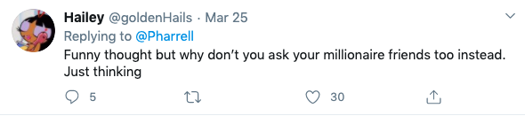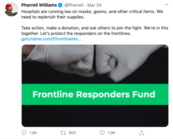 On March 24, Pharrell tweeted a link to a GoFundMe with the caption,