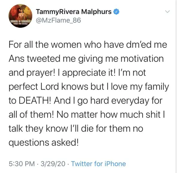 — TammyRivera Malphurs (@MzFlame_86) March 29, 2020