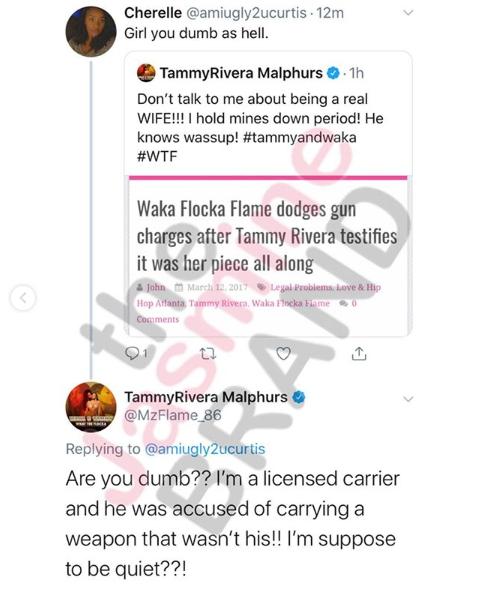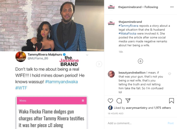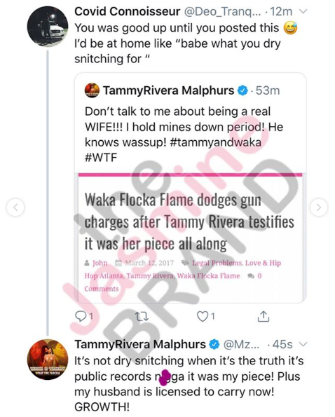 “Don’t talk to me about being a real WIFE!!! I hold mines down period! He knows wassup! #tammyandwaka #WTF…it’s the truth it’s public records n*gga it was my piece! Plus my husband is liscensed to carry now! GROWTH!”