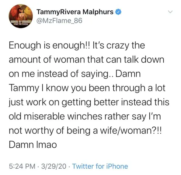 “Enough is enough!! It’s crazy the amount of woman that can talk down on me instead of saying.. D*mn Tammy I know you been through a lot just work on getting better instead this old miserable winches rather say I’m not worthy of being a wife/woman?!! D*mn lmao”