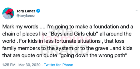 Tory Lanez is using some of his time in quarantine to develop a new organization for kids who are considered less fortunate.