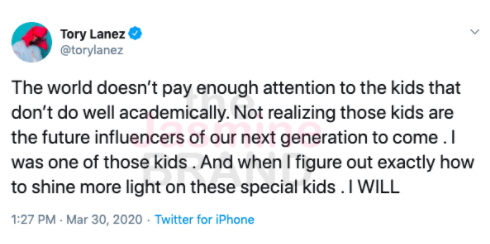 “The world doesn’t pay enough attention to the kids that don’t do well academically. Not realizing those kids are the future influencers of our next generation to come . I was one of those kids . And when I figure out exactly how to shine more light on these special kids . I WILL”