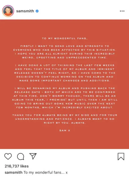 The album had an original scheduled release date of May 1 for all streaming platforms. In addition, Smith reassured fans that before the year is over, the Grammy award winning singer will release his new music.