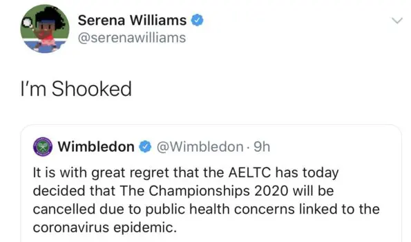 This is the first time the event has been called off since 1945, and 7-time Wimbledon champion, Serena Williams took to Twitter to express her reaction.