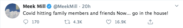 Earlier this month, Meek Mill said back in December (2019) he had flu like symptoms. He said he was extremely sick around Christmas time. Meek revealed he had lost 15 pounds and could barely move. He tweeted,