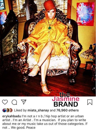 Erykah Badu says she doesn’t want to be labeled a R&B singer or an Urban Artist. The 49-year-old singer wrote on Instagram: