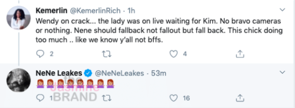 “I don’t have face or time for Facetime. If I don’t do it with my own parents, or the show, why would I be doing it for someone over there? I like NeNe, but she’s still an ‘over there’ person to me. I felt, honestly, here’s where the ambush came in. She says, ‘Wendy, look’ — she was in hair, makeup and wardrobe with all her people, right? we filming and I want you to be on the speaker!’ I said, ‘NeNe, I did that for you once.'”