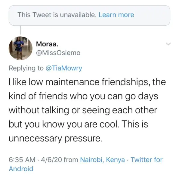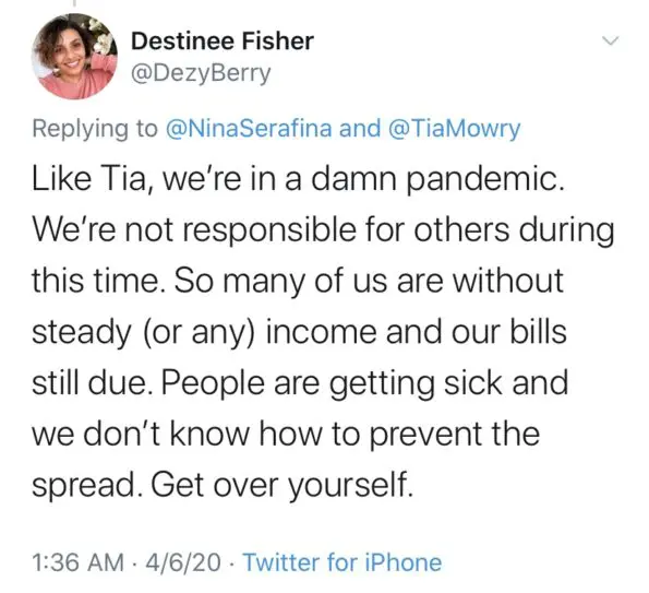 Tia noticeably deleted the tweet amid criticism that her sentiments were selfish – seeing that many are under immense pressure and stress trying to keep their families healthy, and themselves sane during the lock-down.