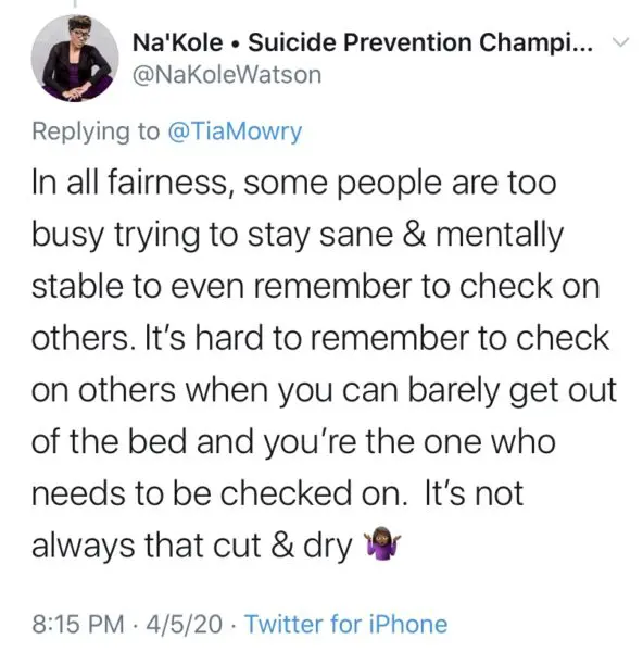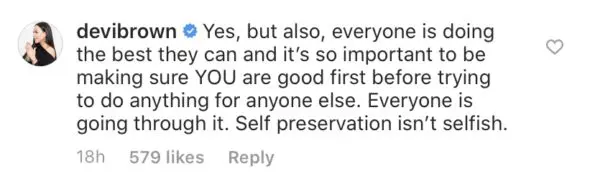 “Yes, but also, everyone is doing the best they can and it’s so important yo be making sure YOU are good first before trying to do anything for anyone else. Everyone is going through it. Self preservation isn’t selfish.”