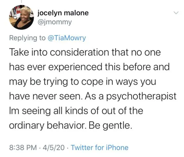 “Take into consideration that no one has ever experienced this before and may be trying to cope in ways you have never seen. As a psychotherapist Im seeing all kinds of out of the ordinary behavior. Be gentle.”