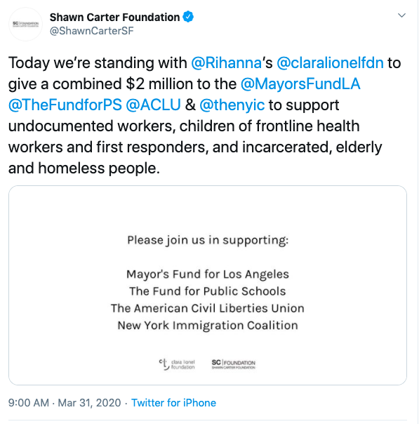 Last month, the singer/beauty mogul teamed up with Jay Z donating a combined $2 Million for the Mayor’s Fund for Los Angeles, which helps healthcare workers, first responders, the elderly, and the homeless. Rihanna has also made an individual donation of $5 Million.