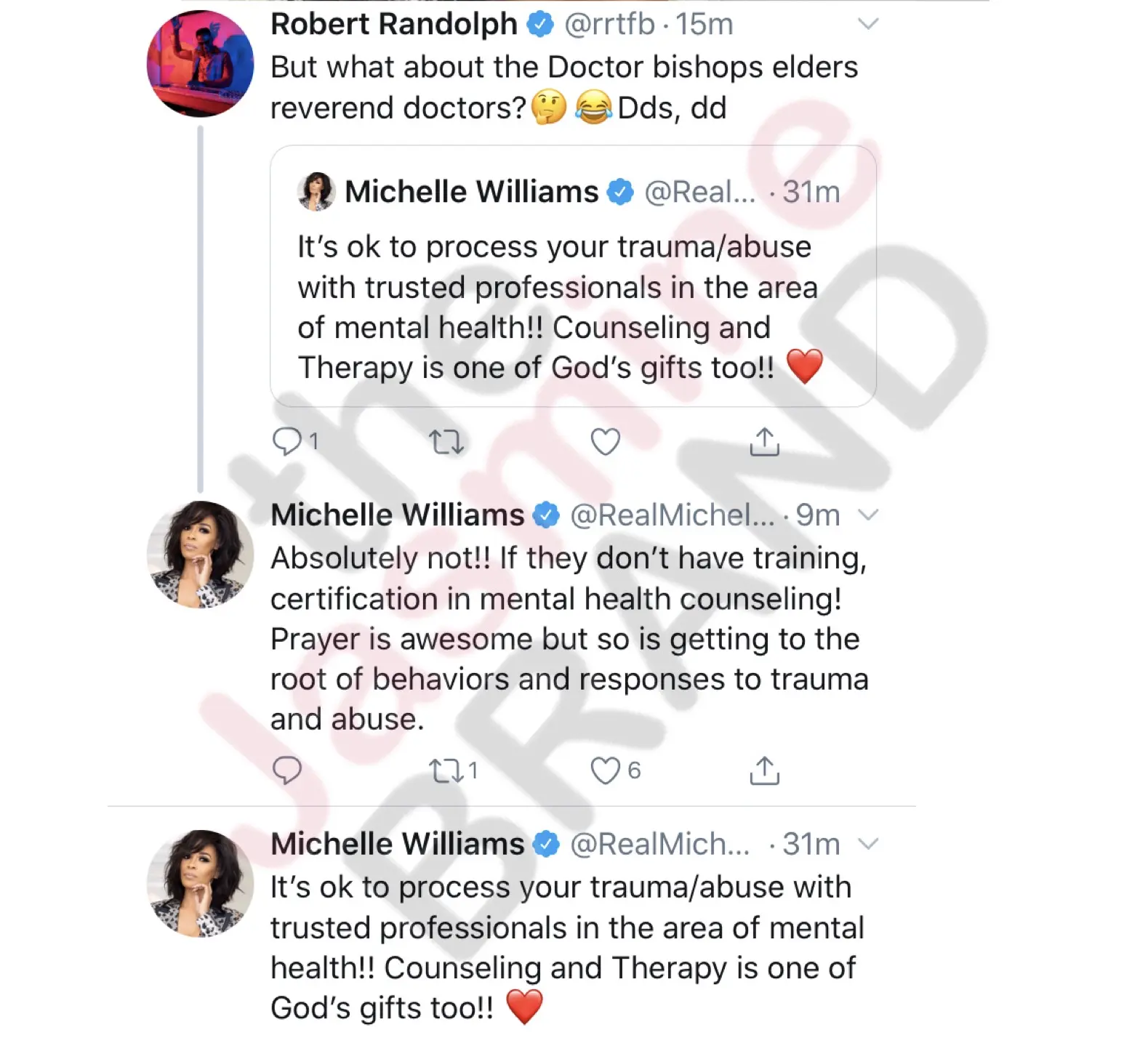A social media user responds to Michelle Williams’s tweet asking if was okay to trust church officials, such as reverends and bishops, with treating mental health. She replied absolutely not: