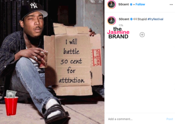 50 Cent responded via Instagram by first trolling Ja Rule over the disgraced Fyre Festival, which Ja Rule was previously sued over, when he used the festival as a hashtag in his post.