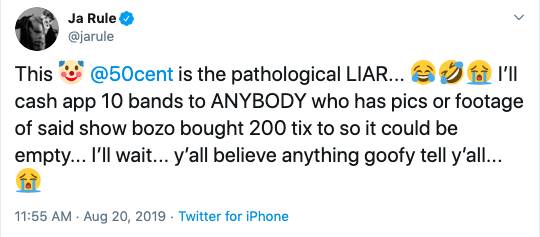 Around that time, Ja Rule also called 50 Cent a “pathological liar” after 50 Cent claimed. he purchased 200 tickets to Ja Rule’s show so the venue would be empty.