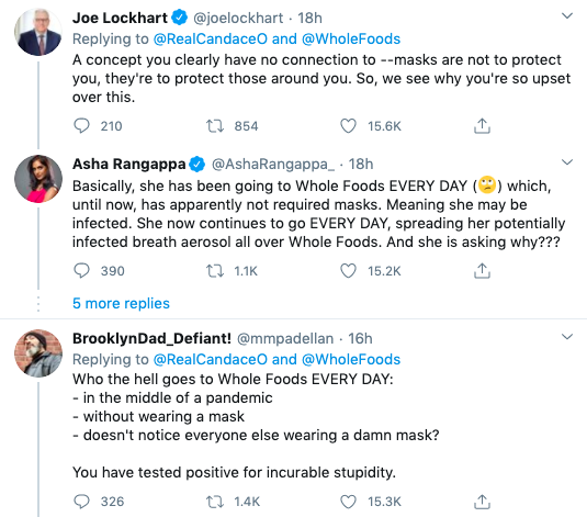 “WOW. Just had a police officer called over to me and my husband at Whole Foods bc we were not wearing masks. We come to this Whole Foods EVERY DAY. Apparently beginning yesterday, it is now illegal to come in without a mask. Total deaths in D.C from Covid? 69. WTF [is] going on?”