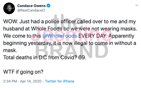 Well-known American conservative and public speaker Candace Owens is no stranger to trending over her personal beliefs. The 30-year-old author appears to be back in the hot seat over her recent tweet regarding supermarket chain Whole Food’s new rules for shoppers to follow while shopping in-store. On Tuesday (April 14th), Candace Owens took to Twitter to vent about a police officer approaching her because she was violating the store’s new regulation that all customers must wear a mask while shopping in-store.