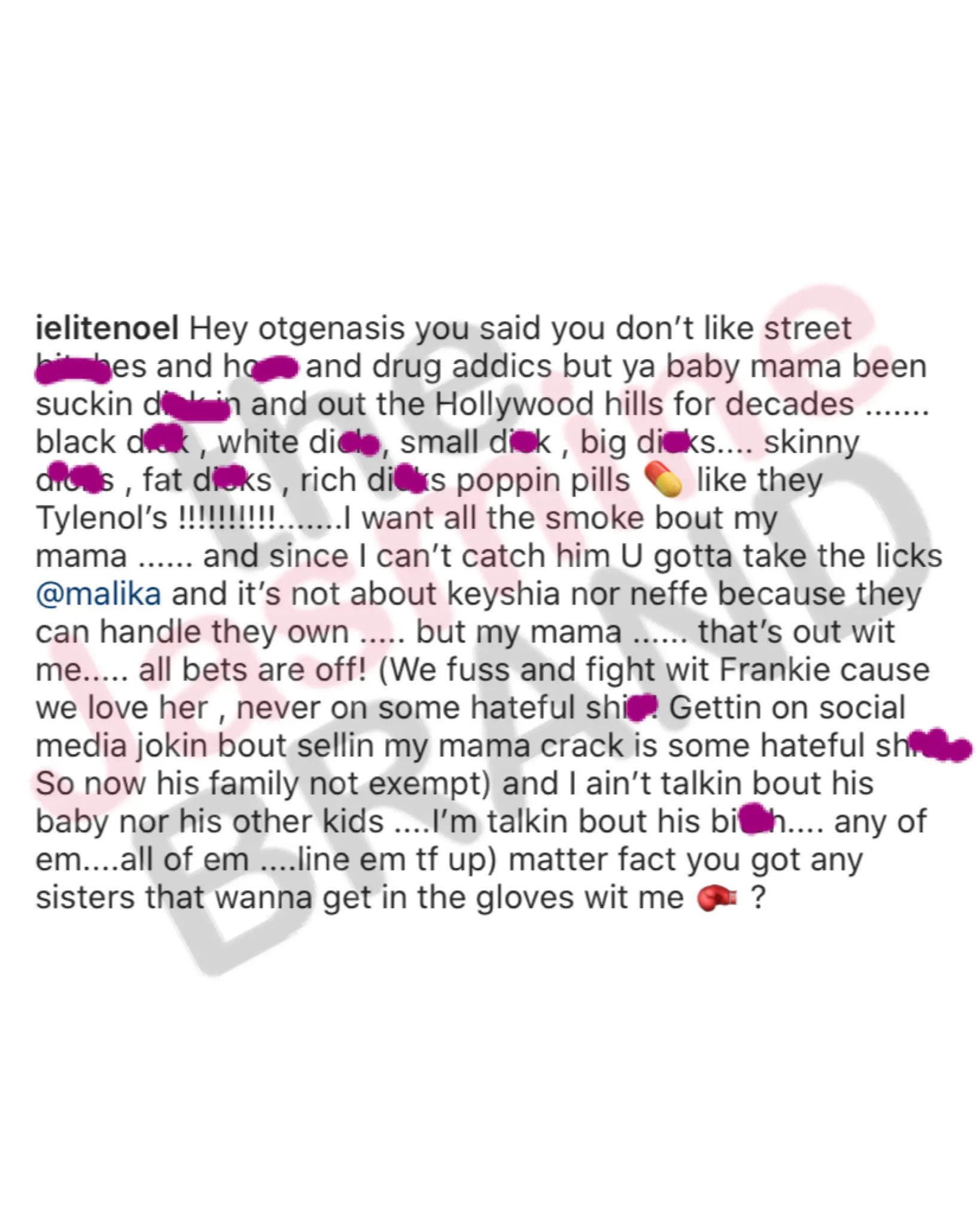 “Hey otgenasis you said you don’t like street b*tches and hoes and drug addics but ya baby mama been suckin d*ck in and out the Hollywood hills for decades ……. black d*ck , white d*ck , small d*ck , big d*cks…. skinny d*cks , fat d*cks , rich d*cks poppin pills ? like they Tylenol’s !!!!!!!!!!…….I want all the smoke bout my mama …… and since I can’t catch him U gotta take the licks @malika and it’s not about keyshia nor neffe because they can handle they own ….. but my mama …… that’s out wit me….. all bets are off! (We fuss and fight wit Frankie cause we love her , never on some hateful sh*t ! Gettin on social media jokin bout sellin my mama crack is some hateful sh*t! So now his family not exempt) and I ain’t talkin bout his baby nor his other kids ….I’m talkin bout his b*tch…. any of em….all of em ….line em tf up) matter fact you got any sisters that wanna get in the gloves wit me ? ?”