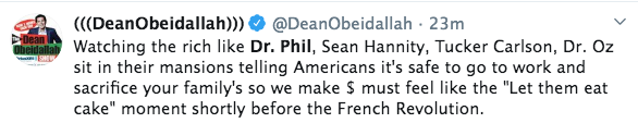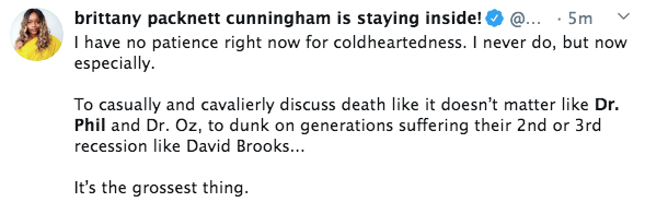 “250 people a year die from poverty. And the poverty line is getting such that more and more people are going to fall below that because the economy is crashing around us. And they’re doing that because people are dying from the coronavirus. I get that”.