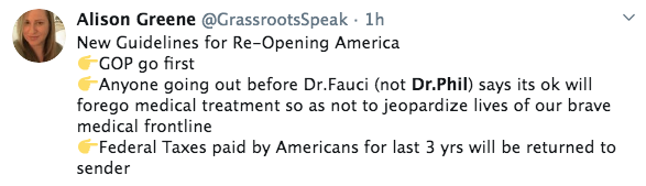 “But look, the fact that the matter is we have people dying, 45,000 people a year die from automobile accidents, 480,000 from cigarettes, 360,000 a year from swimming pools, but we don’t shut the country down for that but yet we’re doing it for this? And the fallout is going to last for years because people’s lives are being destroyed.”