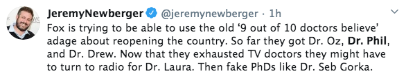 Dr. Phil appears on Laura Ingraham and says we don’t shut the country down for automobile deaths, cigarette related deaths, and swimming pool deaths pic.twitter.com/q8KCgLLClY
