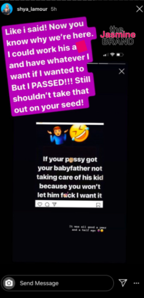 “Like i said! Now you know why we’re here. I could work his a** and have whatever I want if I wanted to But I PASSED!!! Still shouldn’t take that out on your seed!”
