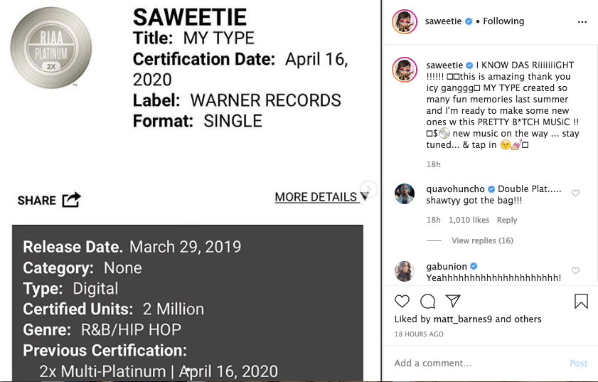This is Saweetie’s second and highest certified song following 2018’s “Icy Girl”. On April 17th Saweetie posted a picture of the certification with the follow caption assuring fans that new music was on the way.